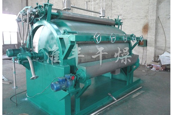 產品概述:滾筒刮板干燥機是一種內加熱傳導型轉動連續干燥設備。旋轉的滾筒通過其下部料槽,粘附著一厚度的料膜,熱量通過管道輸送至滾筒內壁,傳導到滾筒外壁,再傳導給料膜,使料膜中的濕度獲得蒸發、脫濕、使含濕分的物料獲得干燥。干燥好的物料被裝置在滾筒表面的刮刀鏟離滾筒,到置于刮刀下方的螺旋輸送器,通過螺旋輸送器將干物料集中、包裝。